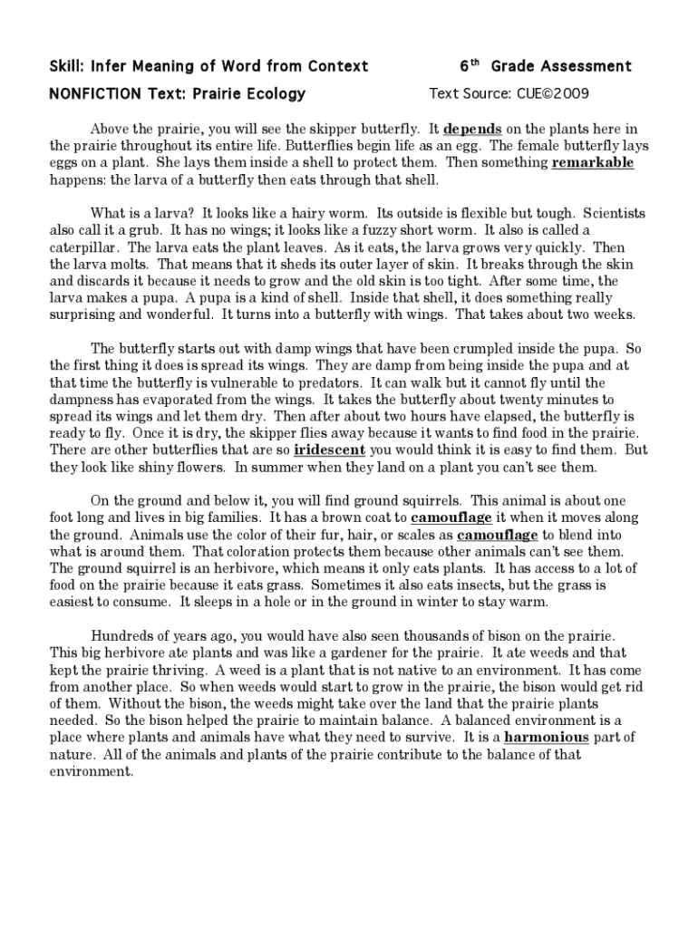 Skill: Infer Meaning of Word from Context NONFICTION Text: Prairie Ecology6 th Grade Assessment Text Source: CUE2009Above the prairie, you will see the skipper butterfly. It depends on the plants