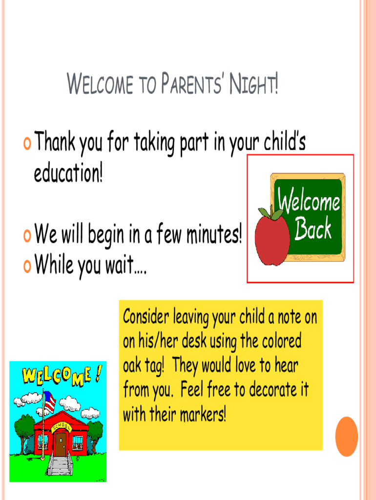 WELCOME TO PARENTS NIGHT! Thankyou for taking part in your childs education! Wewill begin in a few minutes! While you wait. Consider leaving your child a note on on his/her desk using the colored