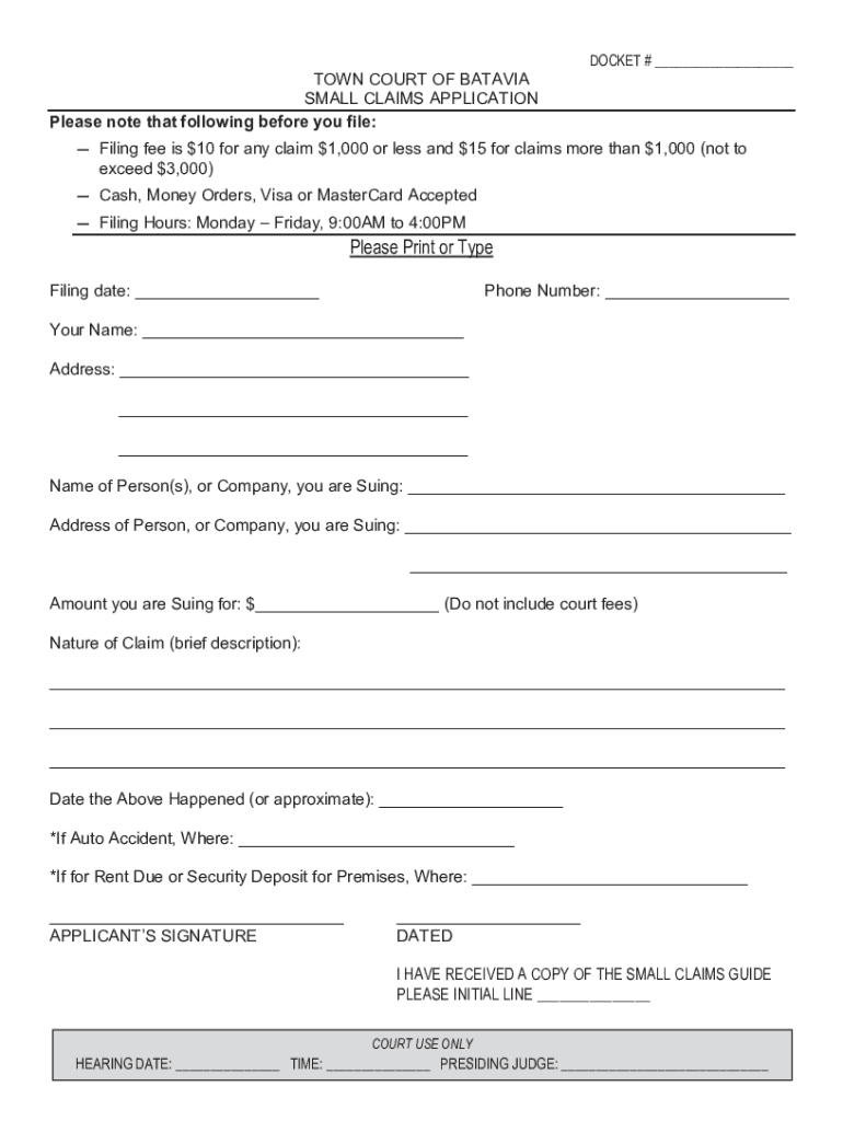 BATAVIA TOWN COURT 3833 WEST MAIN STREET ROAD BATAVIA, NY 14020PHONE: 5853431729 ext 216 FAX: 5853438461 Email: Court@townofbatavia.comSMALL CLAIMS INFORMATION An Individual may sue another individual