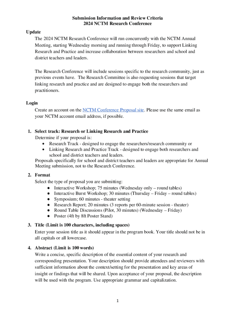 Submission Information and Review Criteria 2024 NCTM Research Conference Update The 2024 NCTM Research Conference will run concurrently with the NCTM Annual Meeting, starting Wednesday morning and