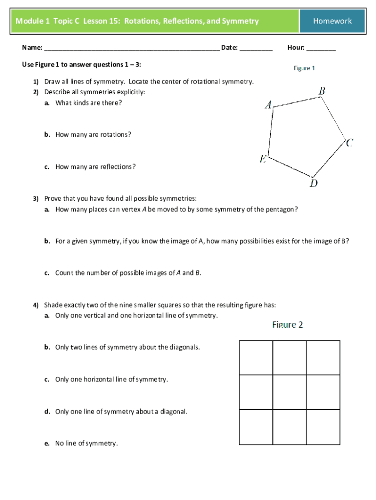 Module 1 Topic C Lesson 15: Rotations, Reflections, and Symmetry Name: ___ Date: ___Homework Hour: ___Use Figure 1 to answer questions 1 3: 1) Draw all lines of symmetry. Locate the center of rotational