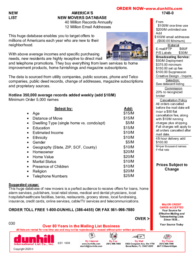 NEW LISTAMERICAS NEW MOVERS DATABASE 40 Million Records Annually 12 Million Email AddressesORDER NOWwww.dunhills.com 17480This huge database enables you to target offers to millions of Americans each