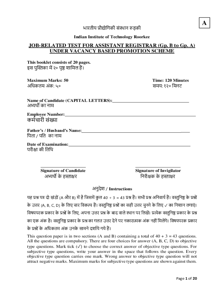 Indian Institute of Technology RoorkeeJOBRELATED TEST FOR ASSISTANT REGISTRAR (Gp. B to Gp. A)