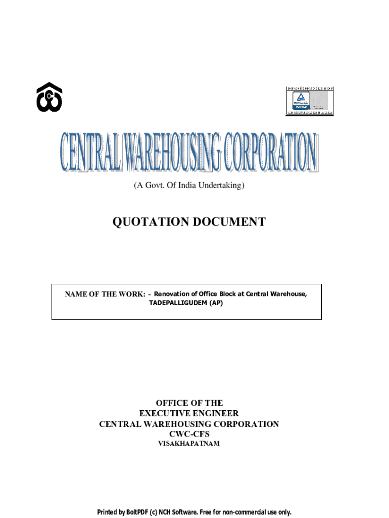 (A Govt. Of India Undertaking)QUOTATION DOCUMENTNAME OF THE WORK: Renovation of Office Block at Central Warehouse, TADEPALLIGUDEM (AP)OFFICE OF THE EXECUTIVE ENGINEER CENTRAL WAREHOUSING CORPORATION