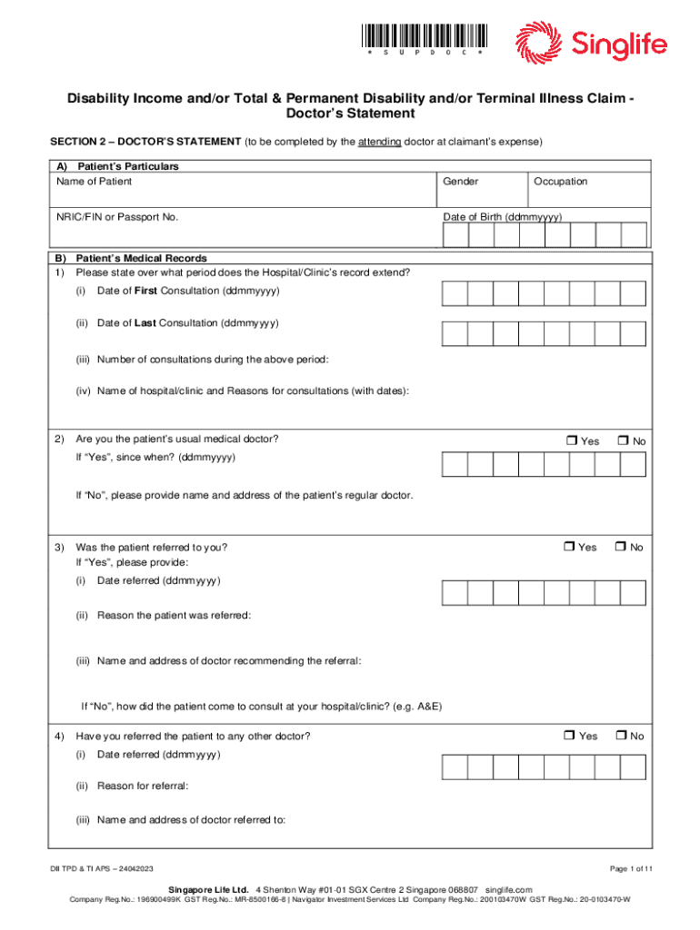 *SUPDOC* Disability Income and/or Total & Permanent Disability and/or Terminal Illness Claim Doctors Statement SECTION 2 DOCTORS STATEMENT (to be completed by the attending doctor at claimants expense)