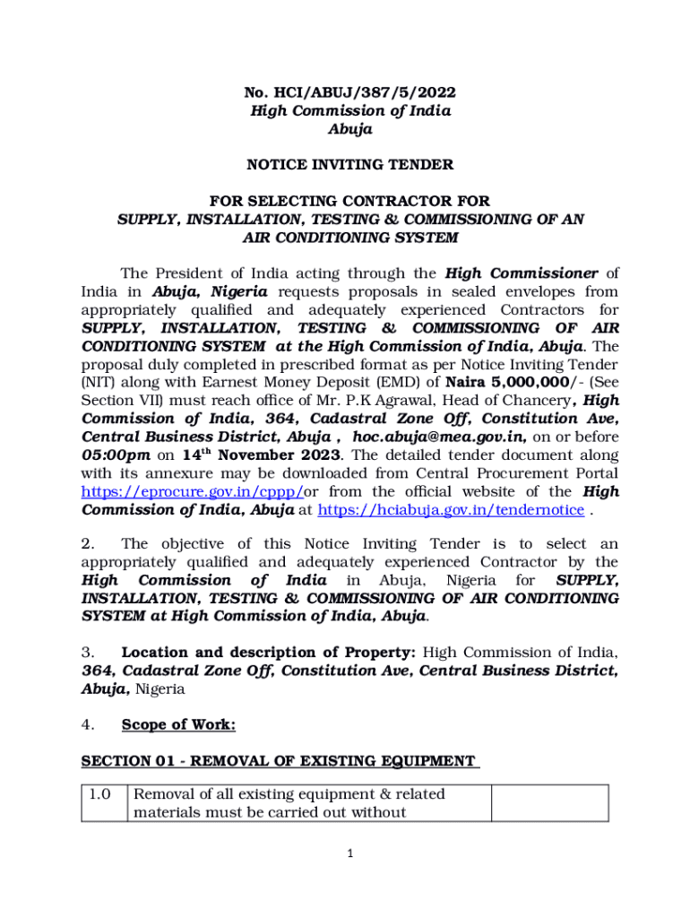No. HCI/ABUJ/387/5/2022 High Commission of India Abuja NOTICE INVITING TENDER FOR SELECTING CONTRACTOR FOR SUPPLY, INSTALLATION, TESTING & COMMISSIONING OF AN AIR CONDITIONING SYSTEM The President