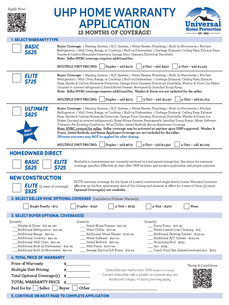 UHP HOME WARRANTY APPLICATIONApply Now!13 MONTHS OF COVERAGE!1. SELECT WARRANTY TYPEBASIC $625Buyer Coverage: 1 Heating System; 1 A/C System; 1 Water Heater; Plumbing; 1 BuiltIn Microwave; 1 Kitchen