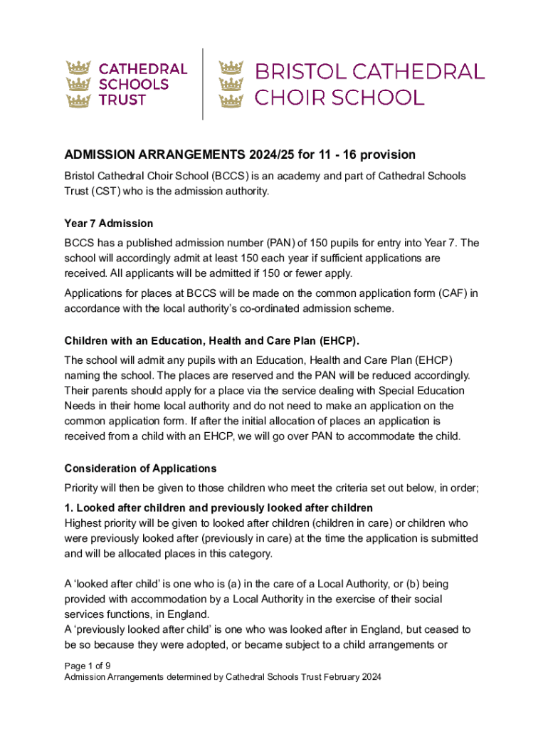 ADMISSION ARRANGEMENTS 2024/25 for 11 16 provision Bristol Cathedral Choir School (BCCS) is an academy and part of Cathedral Schools Trust (CST) who is the admission authority. Year 7 Admission BCCS