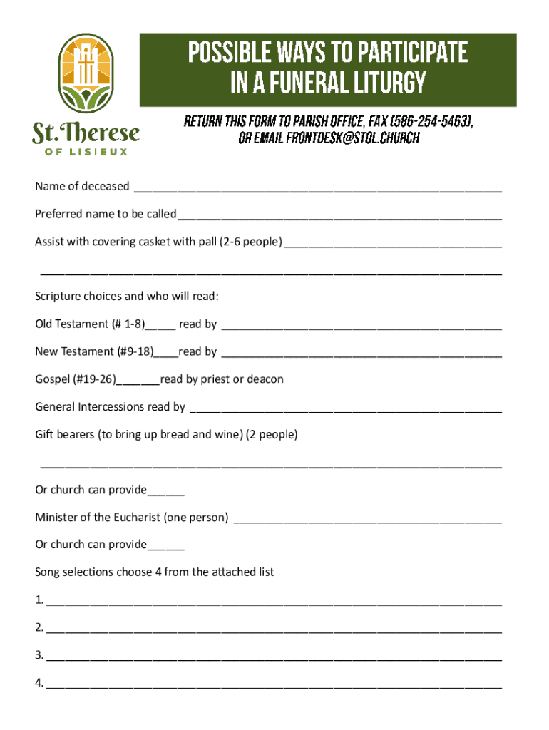 Name of deceased ___ Preferred name to be called ___ Assist with covering casket with pall (26 people) ___ ___ Scripture choices and who will read: Old Testament (# 18)___ read by ___ New Testament