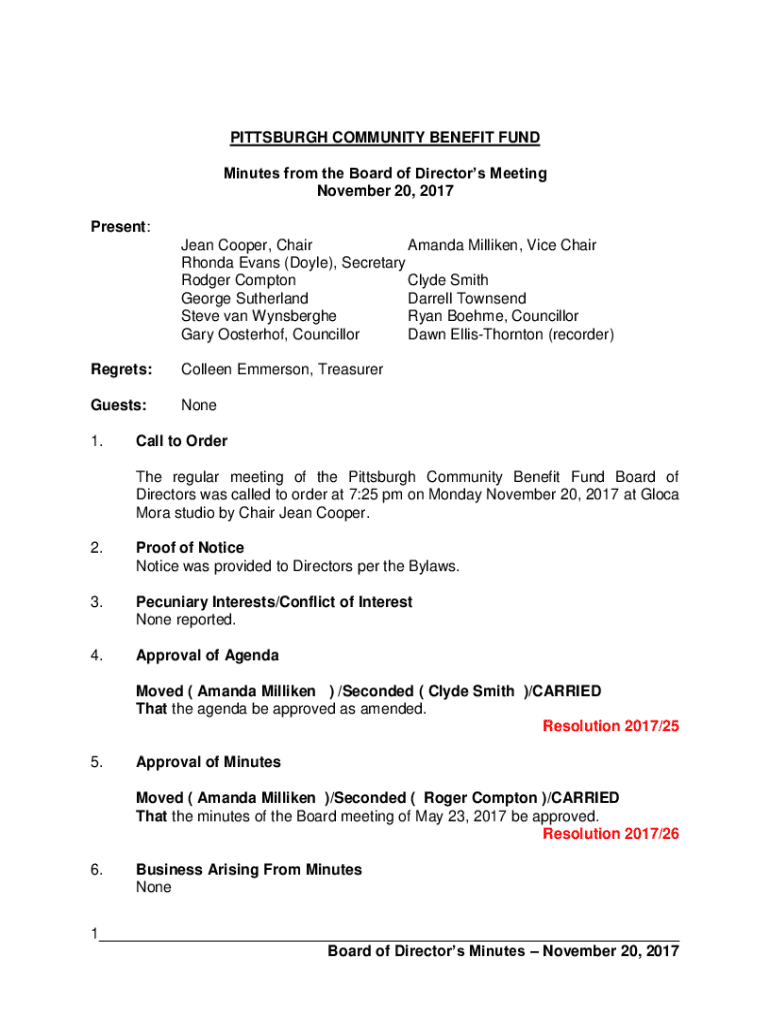 PITTSBURGH COMMUNITY BENEFIT FUND Minutes from the Board of Directors Meeting November 20, 2017 Present: Jean Cooper, Chair Amanda Milliken, Vice Chair Rhonda Evans (Doyle), Secretary Rodger Compton