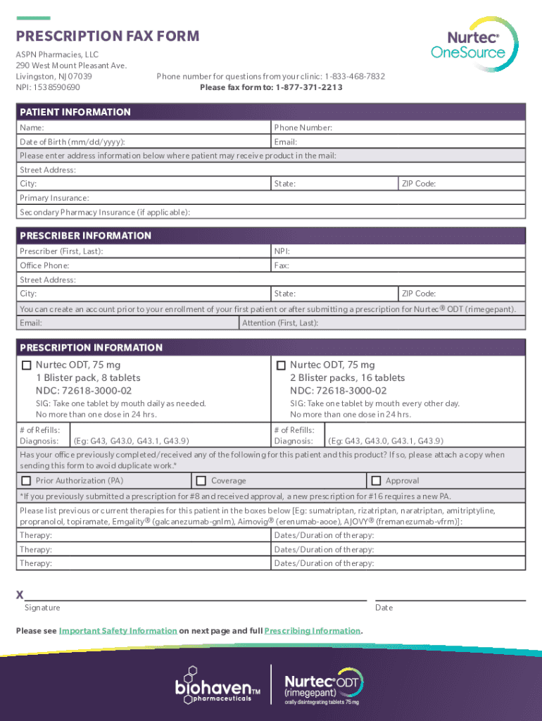 PRESCRIPTION FAX FORM ASPN Pharmacies, LLC 290 West Mount Pleasant Ave. Livingston, NJ 07039 NPI: 1538590690Phone number for questions from your clinic: 18334687832 Please fax form to: 18773712213PATIENT