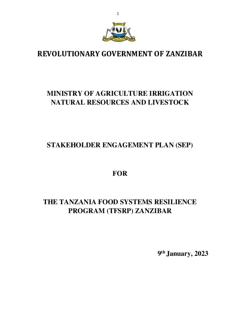 1REVOLUTIONARY GOVERNMENT OF ZANZIBARMINISTRY OF AGRICULTURE IRRIGATION NATURAL RESOURCES AND LIVESTOCKSTAKEHOLDER ENGAGEMENT PLAN (SEP)FORTHE TANZANIA FOOD SYSTEMS RESILIENCE PROGRAM (TFSRP) ZANZIBAR9th