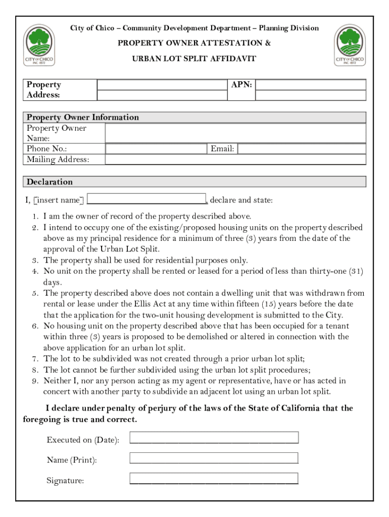 City of Chico Community Development Department Planning DivisionPROPERTY OWNER ATTESTATION & URBAN LOT SPLIT AFFIDAVITProperty Address:APN:Property Owner Information Property Owner Name: Phone No.:
