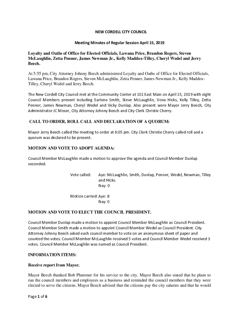 NEW CORDELL CITY COUNCIL Meeting Minutes of Regular Session April 15, 2019 Loyalty and Oaths of Office for Elected Officials, Lawana Price, Brandon Rogers, Steven McLaughlin, Zetta Penner, James Newman