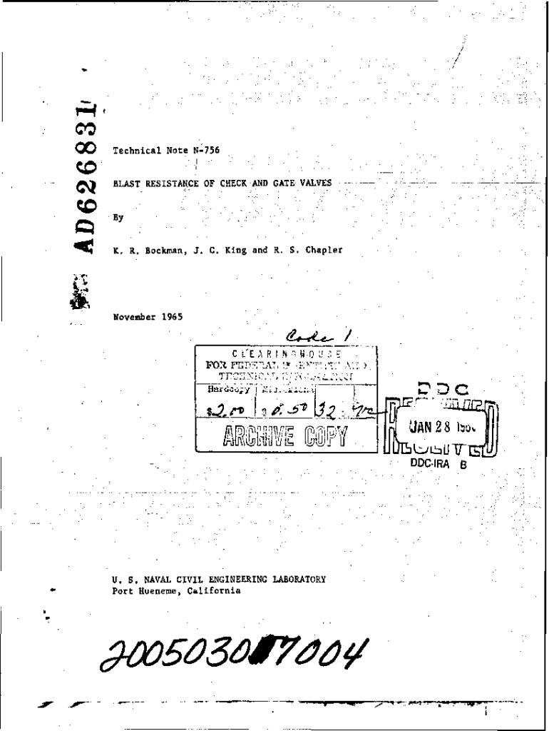 CODTechnical Note N756BLAST RESISTANCE OF CHECKAND GATE VALVESBy K. R. Bockman, 3. C. King and R. S. ChaplerSNovember 1965C CER I PPO1 7 F11.2 A1W13OJ UjU. S. NAVAL CIVIL ENGINEERING LABORATORY 4WPort