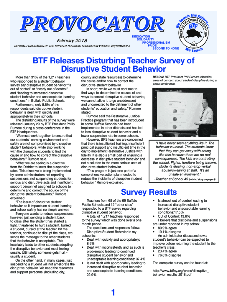 DEDICATIONSOLIDARITYPROFESSIONALISM OFFICIAL PUBLICATION OF THE BUFFALO TEACHERS FEDERATION VOLUME 48/NUMBER 3PRIDESECOND TO NONEFebruary 2018BTF Releases Disturbing Teacher Survey of Disruptive Student