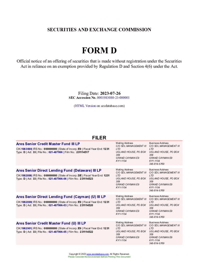 Get the free Ares Senior Credit Master Fund III LP Form D Filed 2023-07-26. Accession Number