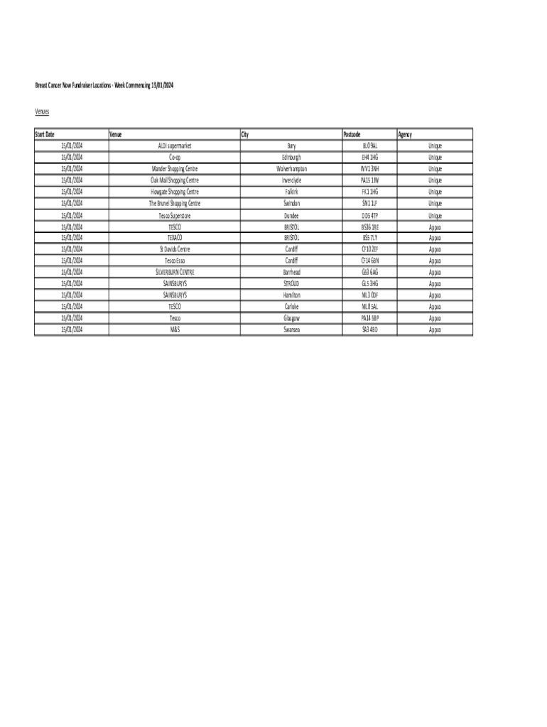 Breast Cancer Now Fundraiser Locations Week Commencing 15/01/2024 Venues Start DateVenue 15/01/2024 15/01/2024 15/01/2024 15/01/2024 15/01/2024 15/01/2024 15/01/2024 15/01/2024 15/01/2024 15/01/2024