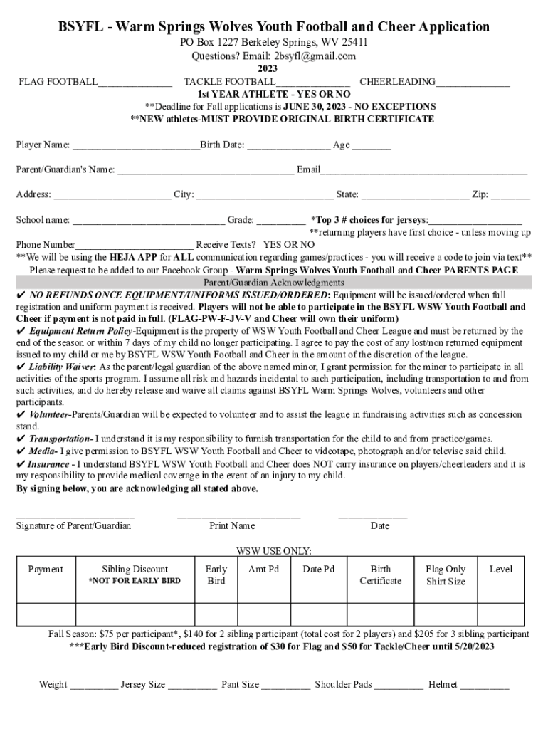 BSYFL Warm Springs Wolves Youth Football and Cheer Application PO Box 1227 Berkeley Springs, WV 25411 Questions? Email: 2bsyfl@gmail.com 2023 TACKLE FOOTBALL___ CHEERLEADING___ 1st YEAR ATHLETE YES