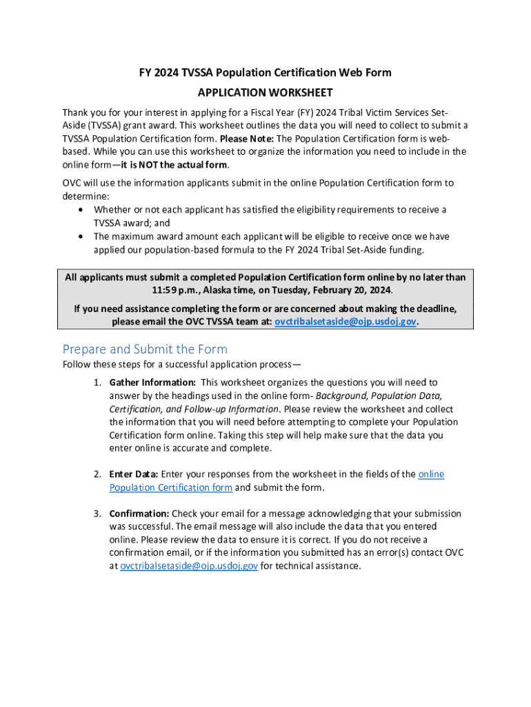 FY 2024 TVSSA Population Certification Web Form APPLICATION WORKSHEET Thank you for your interest in applying for a Fiscal Year (FY) 2024 Tribal Victim Services SetAside (TVSSA) grant award. This