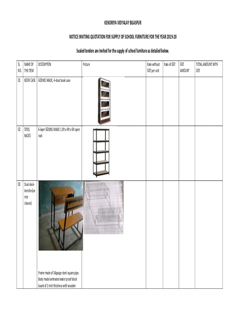 KENDRIYA VIDYALAY BILASPUR NOTICE INVITING QUOTATION FOR SUPPLY OF SCHOOL FURNITURE FOR THE YEAR 201920 Sealed tenders are invited for the supply of school furniture as detailed below. SL NO.NAME