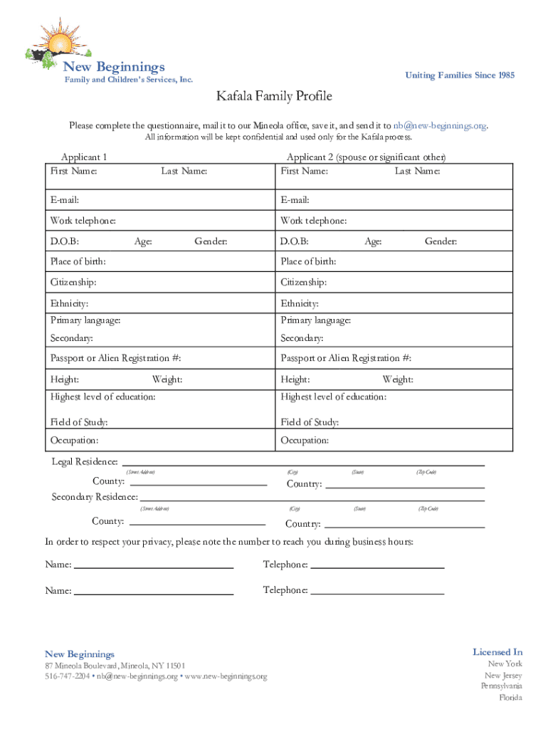 New BeginningsUniting Families Since 1985Family and Children\'s Services, Inc.Kafala Family Profile Please complete the questionnaire, mail it to our Mineola office, save it, and send it to nb@newbeginnings.org.