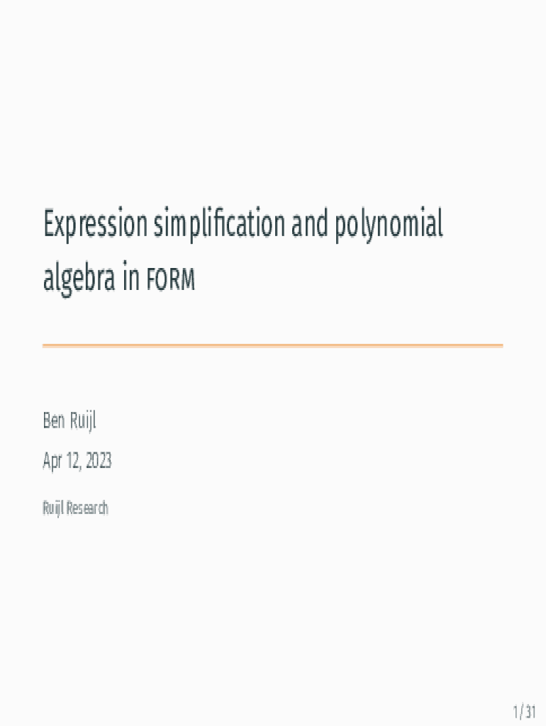 Expression simplification and polynomial algebra in FORMBen Ruijl Apr 12, 2023 Ruijl Research1 / 31Introduction This talk considers the C++ routines in FORM optimize.cc: expression simplification