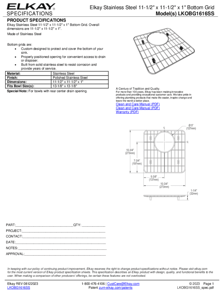 SPECIFICATIONSElkay Stainless Steel 111/2\" x 111/2\" x 1\" Bottom Grid Model(s) LKOBG1616SSPRODUCT SPECIFICATIONS Elkay Stainless Steel 111/2\" x 111/2\" x 1\" Bottom Grid. Overall dimensions are