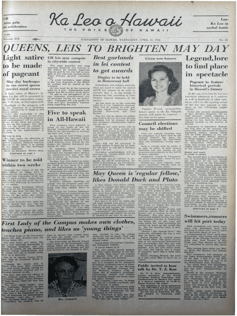 UH joins gala lei celebration CE0 i:MAWALauKa Leo in verbal battlez 868 \'vowMExixUNIVERSITY OF HAWAII, WEDNESDAY, APRIL 30, 1941No . .53QUEENS, LEIS. TO . BRIGHTEN MAY DAY Light satire to he made