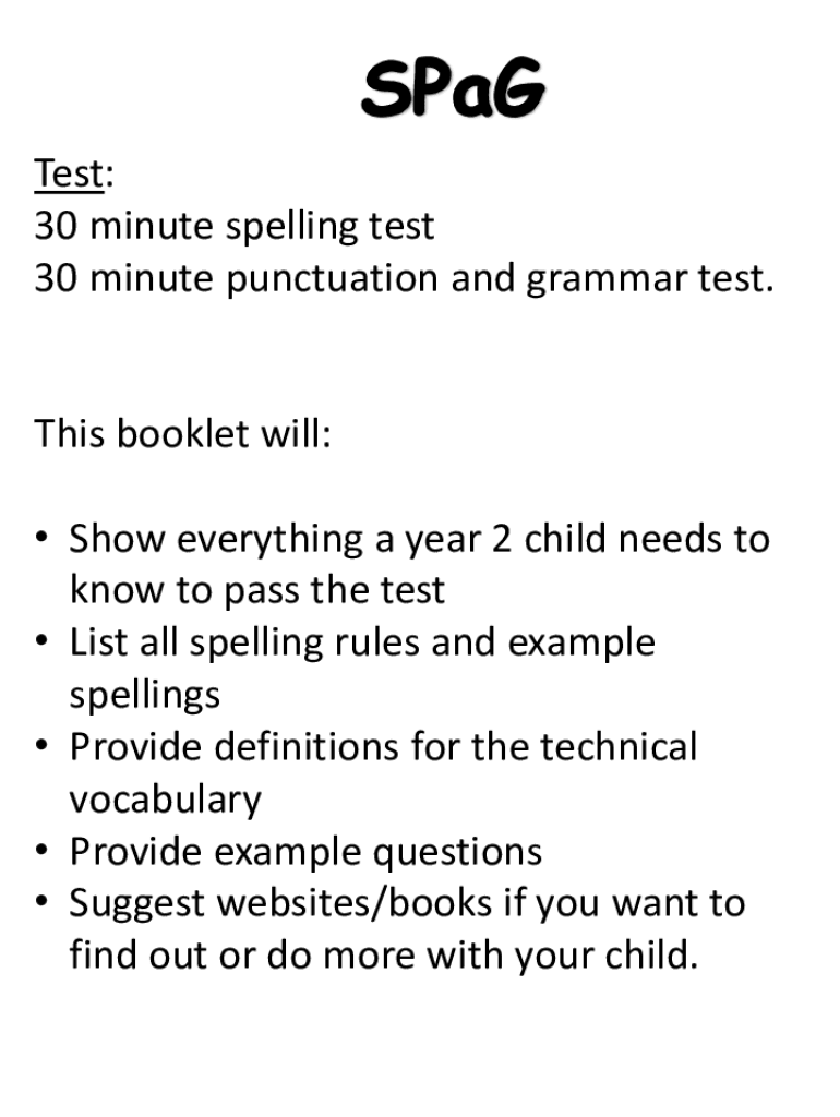 Test: 30 minute spelling test 30 minute punctuation and grammar test.This booklet will: Show everything a year 2 child needs to know to pass the test List all spelling rules and example spellings