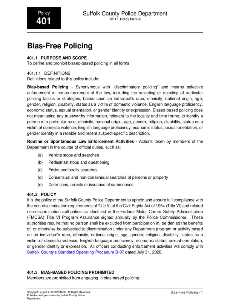 PolicySuffolk County Police Department401NY LE Policy ManualBiasFree Policing 401.1 PURPOSE AND SCOPE To define and prohibit biasedbased policing in all forms. 401.1.1 DEFINITIONS Definitions related
