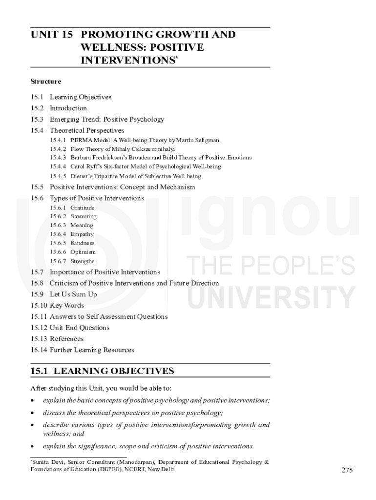 UNIT 15 PROMOTING GROWTH AND WELLNESS: POSITIVE INTERVENTIONS*Successful AgeingStructure 15.1 Learning Objectives 15.2 Introduction 15.3 Emerging Trend: Positive Psychology 15.4 Theoretical Perspectives