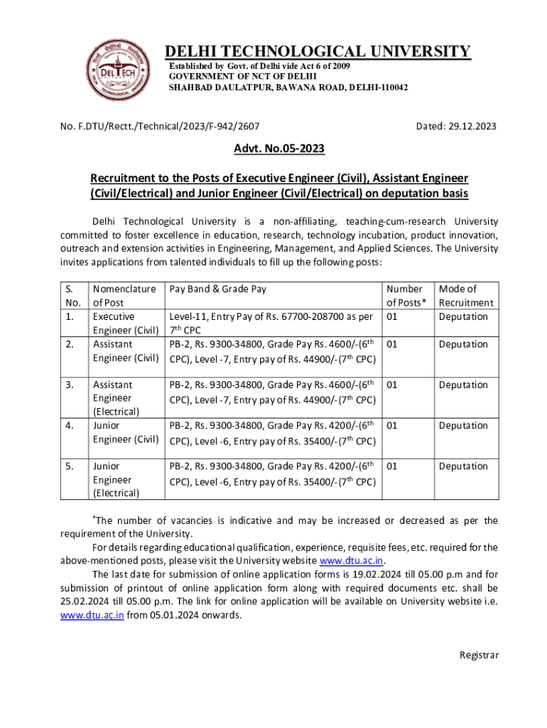 DELHI TECHNOLOGICAL UNIVERSITY Established by Govt. of Delhi vide Act 6 of 2009 GOVERNMENT OF NCT OF DELHI SHAHBAD DAULATPUR, BAWANA ROAD, DELHI110042No. F.DTU/Rectt./Technical/2023/F942/2607Dated: