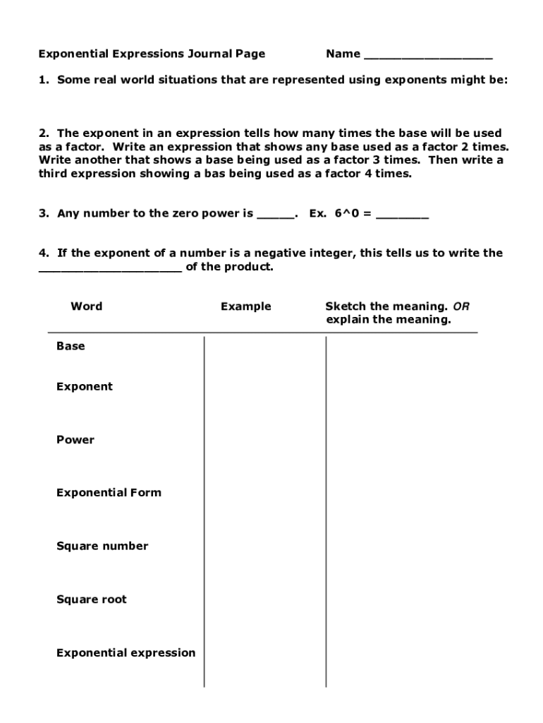 Exponential Expressions Journal PageName ___1. Some real world situations that are represented using exponents might be:2. The exponent in an expression tells how many times the base will be used