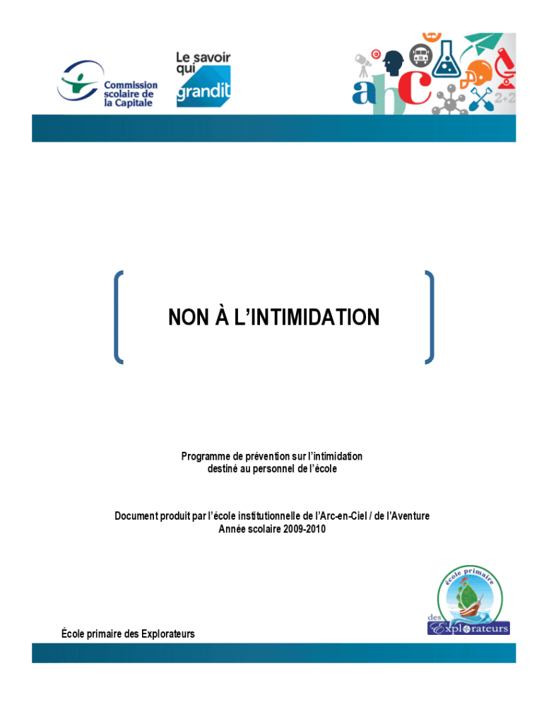 NON LINTIMIDATIONProgramme de prvention sur lintimidation destin au personnel de lcoleDocument produit par lcole institutionnelle de lArcenCiel / de lAventure Anne scolaire 20092010cole primaire des