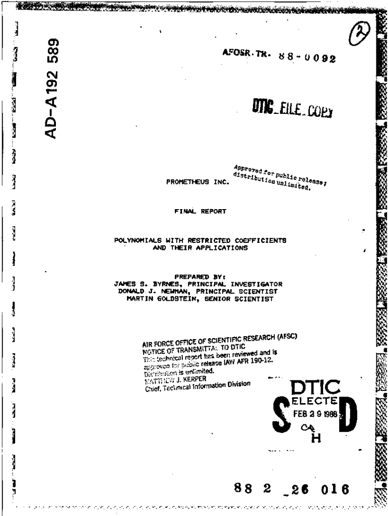 0092TH8. AFOSR.Th.)00PROMETHEUS INC.eease\'erlbilauFINAL REPORTPOLYNOMIALS WITH RESTRICTED COEFFICIENTS AND THEIR APPLICATIONSPREPARED BY: JAMES S. BYRNES, PRINCIPAL INVESTIGATOR DONALD. J. NEWMAN,