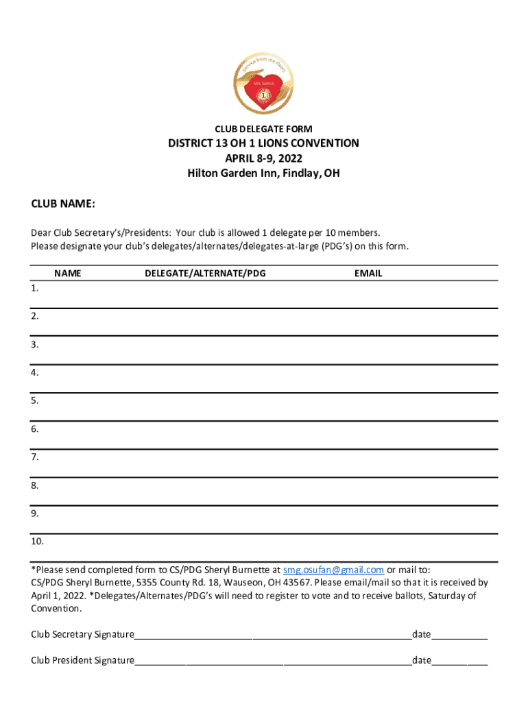 CLUB DELEGATE FORMDISTRICT 13 OH 1 LIONS CONVENTION APRIL 89, 2022 Hilton Garden Inn, Findlay, OH CLUB NAME: Dear Club Secretarys/Presidents: Your club is allowed 1 delegate per 10 members. Please