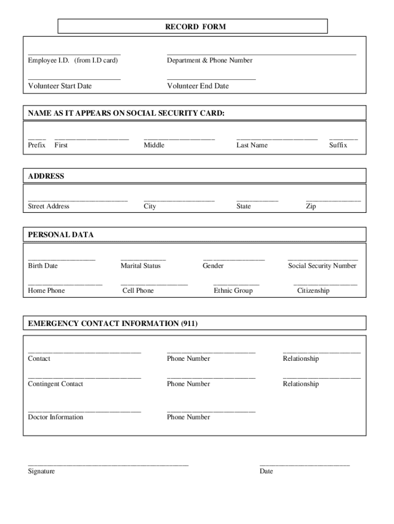 RECORD FORM ___ Employee I.D. (from I.D card) ___ Employee I. D ___ Volunteer Start Date___ Department & Phone Number ___ Department & Phone number ___ Volunteer End DateNAME AS IT APPEARS ON SOCIAL
