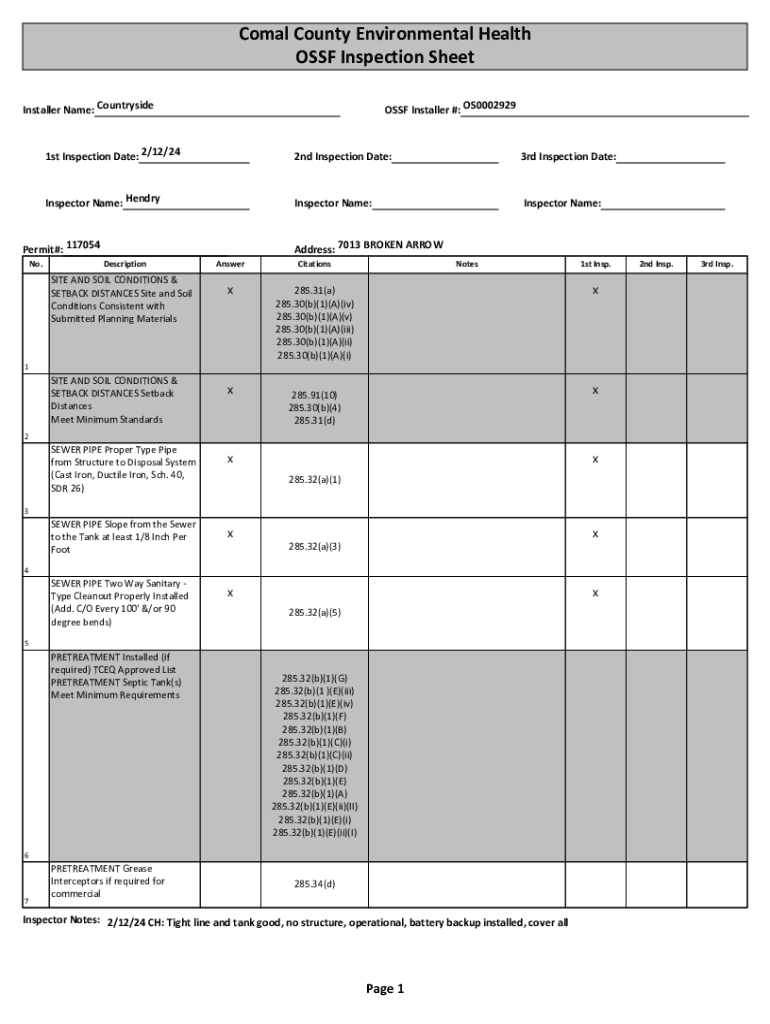 Comal County Environmental Health OSSF Inspection Sheet OSSF Installer #: OS0002929Installer Name: Countryside 1st Inspection Date: 2/12/242nd Inspection Date:3rd Inspection Date:Inspector Name: HendryInspector