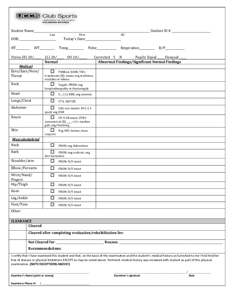 Student Name___ Student ID # ___ LastFirstDOB:___ HT___WT___Vision (R) 20/___ Medical Eyes/Ears/Nose/ ThroatMITodays Date:___ Temp___Pulse___(L) 20/___ OU 20/___ NormalRespiration___B/P___Corrected