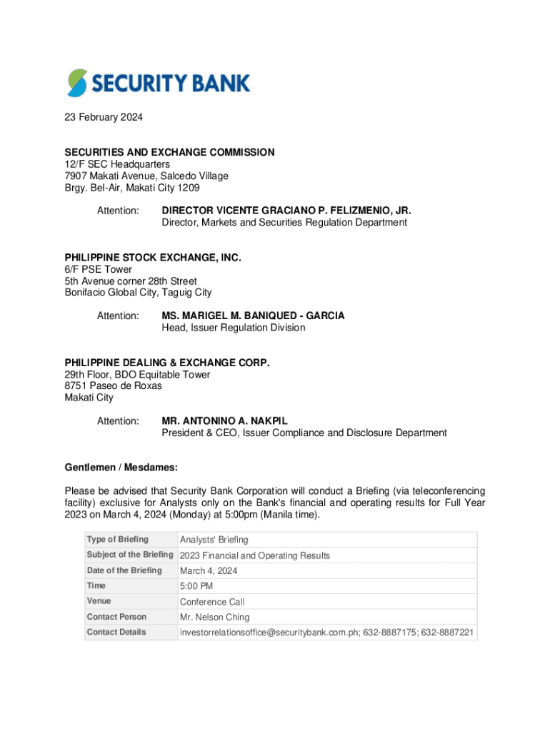23 February 2024SECURITIES AND EXCHANGE COMMISSION 12/F SEC Headquarters 7907 Makati Avenue, Salcedo Village Brgy. BelAir, Makati City 1209 Attention:DIRECTOR VICENTE GRACIANO P. FELIZMENIO, JR. Director,