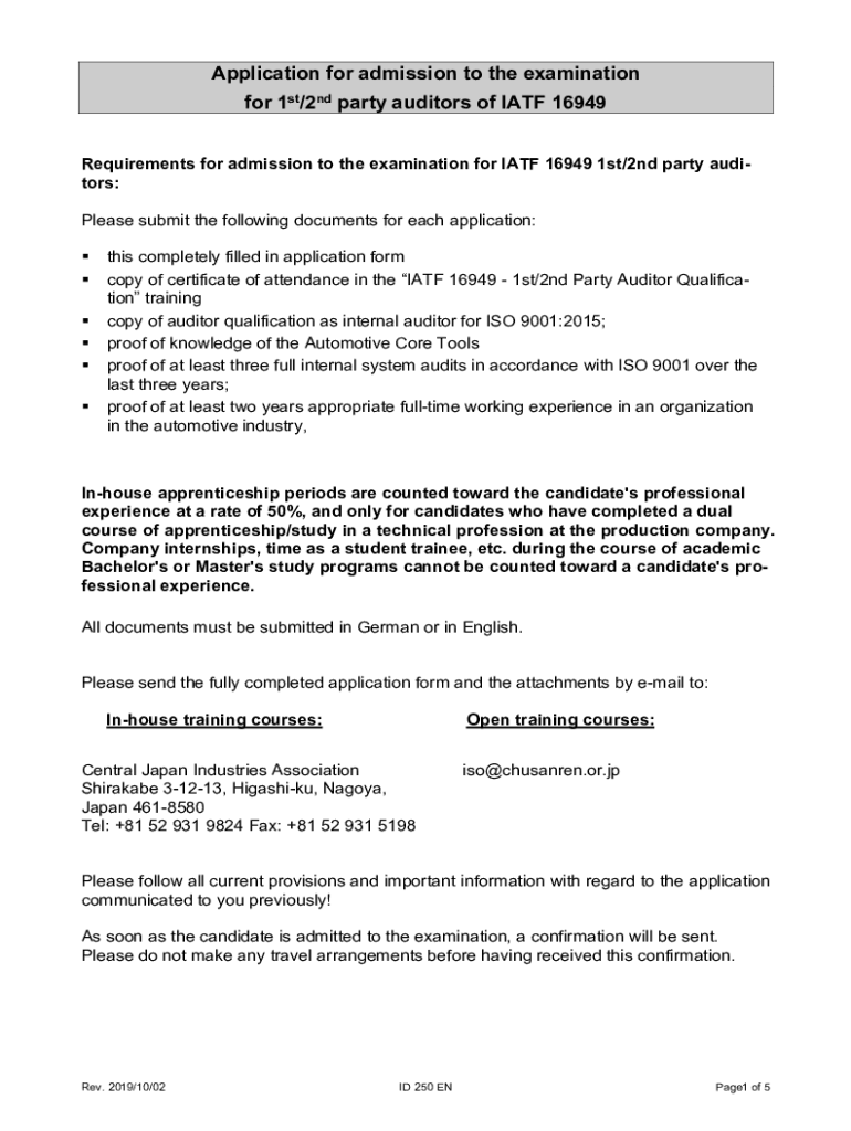 Application for admission to the examination for 1st/2nd party auditors of IATF 16949 Requirements for admission to the examination for IATF 16949 1st/2nd party auditors: Please submit the following