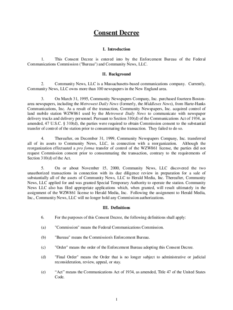 Consent Decree I. Introduction 1. This Consent Decree is entered into by the Enforcement Bureau of the Federal Communications Commission (\"Bureau\") and Community News, LLC. II. Background 2. Community