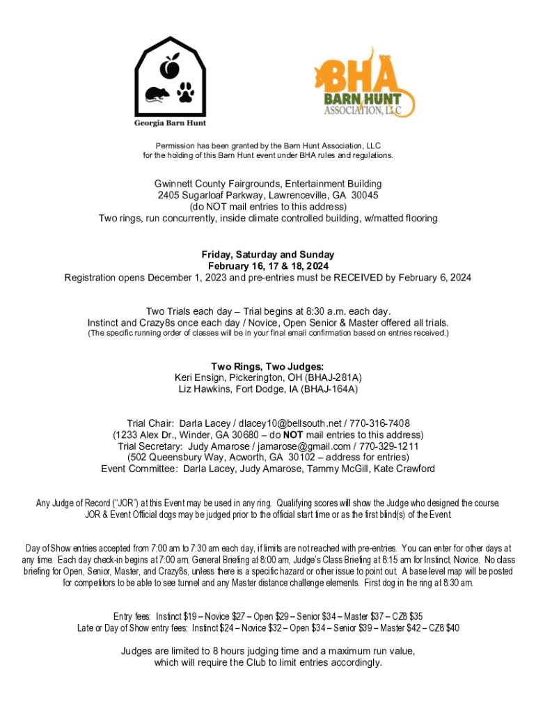 Permission has been granted by the Barn Hunt Association, LLC for the holding of this Barn Hunt event under BHA rules and regulations.Gwinnett County Fairgrounds, Entertainment Building 2405 Sugarloaf
