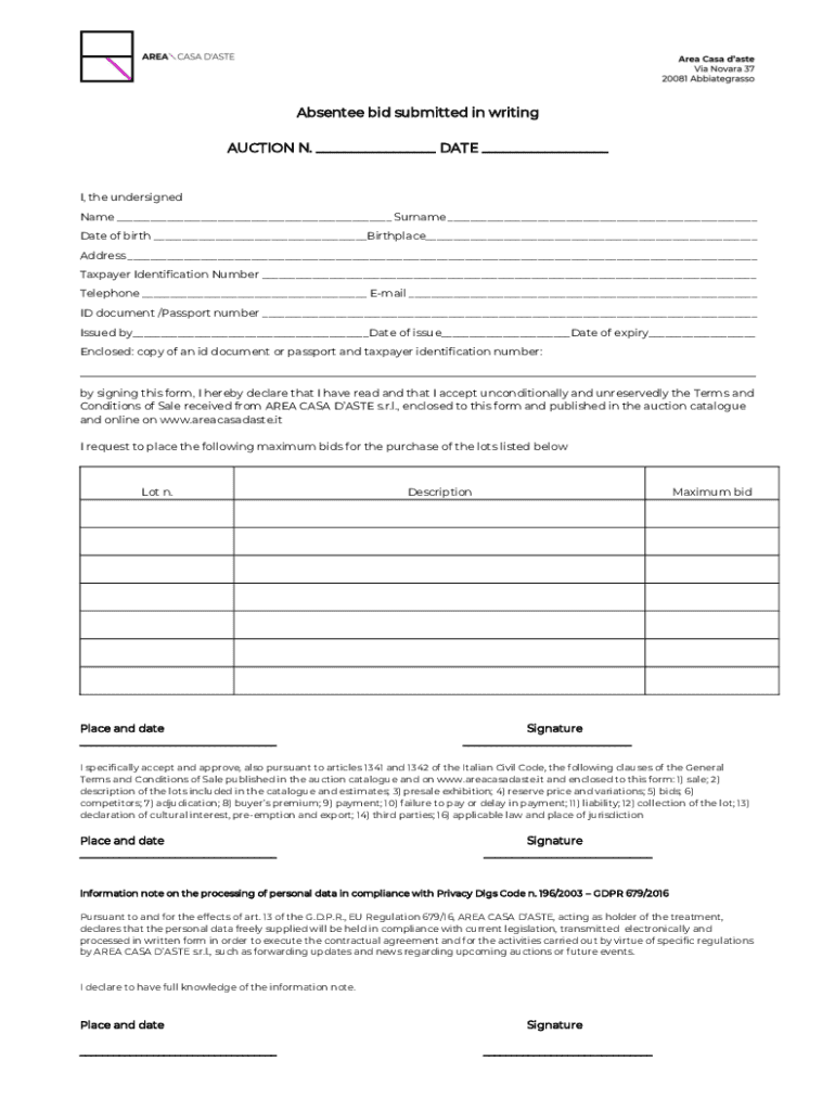 Absentee bid submitted in writing AUCTION N. ___ DATE ___I, the undersigned Name ___ Surname ___ Date of birth ___Birthplace___ Address ___ Taxpayer Identification Number ___ Telephone ___ Email ___
