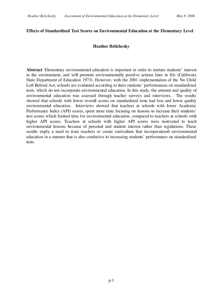 Heather BelicheskyAssessment of Environmental Education at the Elementary LevelMay 8 2006Effects of Standardized Test Scores on Environmental Education at the Elementary LevelHeather BelicheskyAbstract