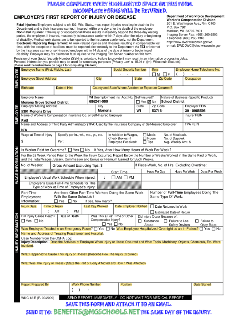 PLEASE COMPLETE EVERY HIGHLIGHTED SPACE ON THIS FORM. INCOMPLETE FORMS WILL BE RETURNED. Department of Workforce Development Workers Compensation Division 201 E. Washington Ave., Rm. C100 P.O. Box