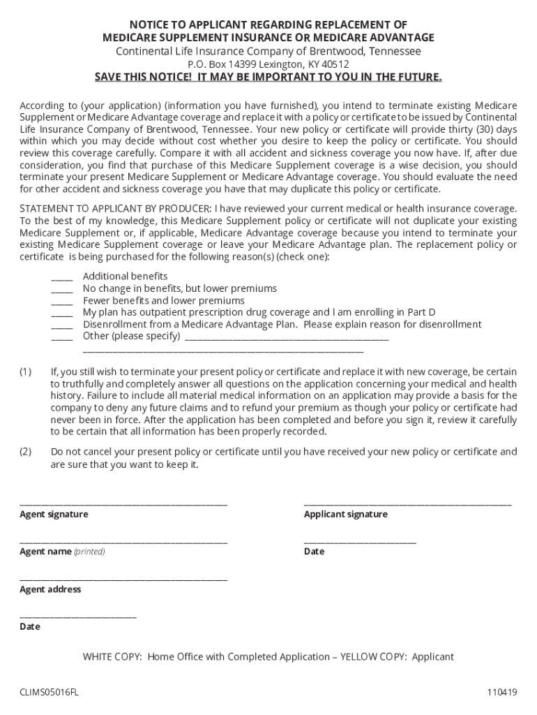 NOTICE TO APPLICANT REGARDING REPLACEMENT OF MEDICARE SUPPLEMENT INSURANCE OR MEDICARE ADVANTAGE Continental Life Insurance Company of Brentwood, Tennessee P.O. Box 14399 Lexington, KY 40512SAVE THIS