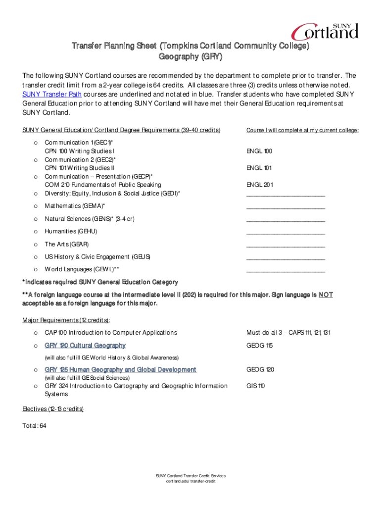 Transfer Planning Sheet (Tompkins Cortland Community College) Geography (GRY) The following SUNY Cortland courses are recommended by the department to complete prior to transfer. The transfer credit