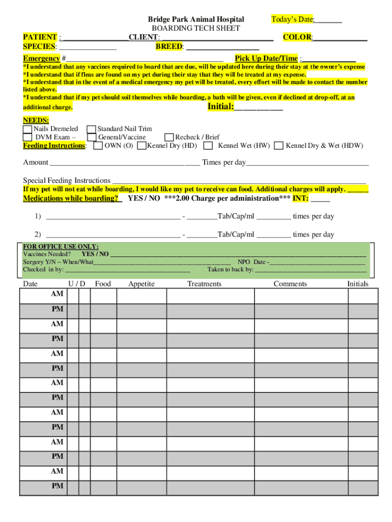 Bridge Park Animal Hospital Todays Date: ___ BOARDING TECH SHEET PATIENT : ___CLIENT: ___ COLOR:___ SPECIES: ___ BREED: ___ Emergency #___Pick Up Date/Time :___*I understand that any vaccines required